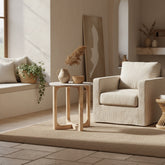 Het royale marmeren blad biedt genoeg ruimte voor dagelijkse items of decoratie, terwijl het houten onderstel een luchtig en natuurlijk karakter toevoegt. De combinatie van materialen maakt deze tafel een harmonieuze mix van luxe en warmte.