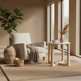 De marmeren bijzettafel rond Bruin van Raw Materials is een echte blikvanger in elk interieur. Het ronde tafelblad van massief bruin marmer heeft een prachtig natuurlijk patroon met nuances van wit, grijs en bruin. Het lichte houten onderstel in kruisvorm zorgt voor stabiliteit én een stijlvol contrast.