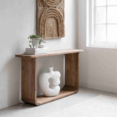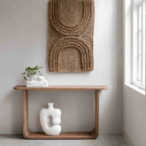 Het massieve teakhout geeft deze console een robuust en duurzaam karakter. De lichte houtkleur straalt warmte uit en zorgt voor een natuurlijke balans in je interieur.
