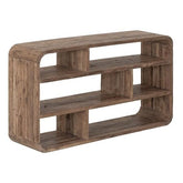 De combinatie van rustiek teakhout en de open indeling maakt de Corso-dressoir zowel praktisch als decoratief. Met zijn ronde vormen en open vakken heeft het stuk een speelse uitstraling.
