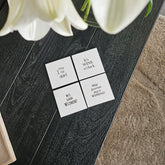 Of het nou gaat om een avondje gezellig borrelen, een warm kopje thee of een frisse cider, donkere en hardnekkige kringen op je tafel zijn geen vrienden van de familie. En met losse viltjes of tijdschriften te werken ben je inmiddels ook wel klaar mee. Onderzetters voor glazen moeten ook niet overal rondslingeren. Het moet er stijlvol bijpassen, voor op je tafel en in de woonkamer. Daarvoor zijn deze witte met zwarte onderzetters met zwarte tekst precies voor geschikt!