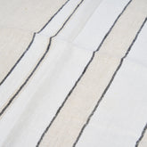 Er is een subtiel genoegen in het gladstrijken van de stof voor het aanschuiven, waarbij de strepen telkens anders uitlijnen. Geweven en afgewerkt in India van linnen draagt de stof lichte verschuivingen in textuur en toon gevormd door materiaal en proces.