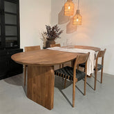 De moderne Bullnose eettafel is gemaakt van mangohout. De organische vorm van de tafel is afgerond, zowel aan de zijkanten als aan de onderkant. Deze eettafel is verkrijgbaar in de kleuren bruin en zwart.