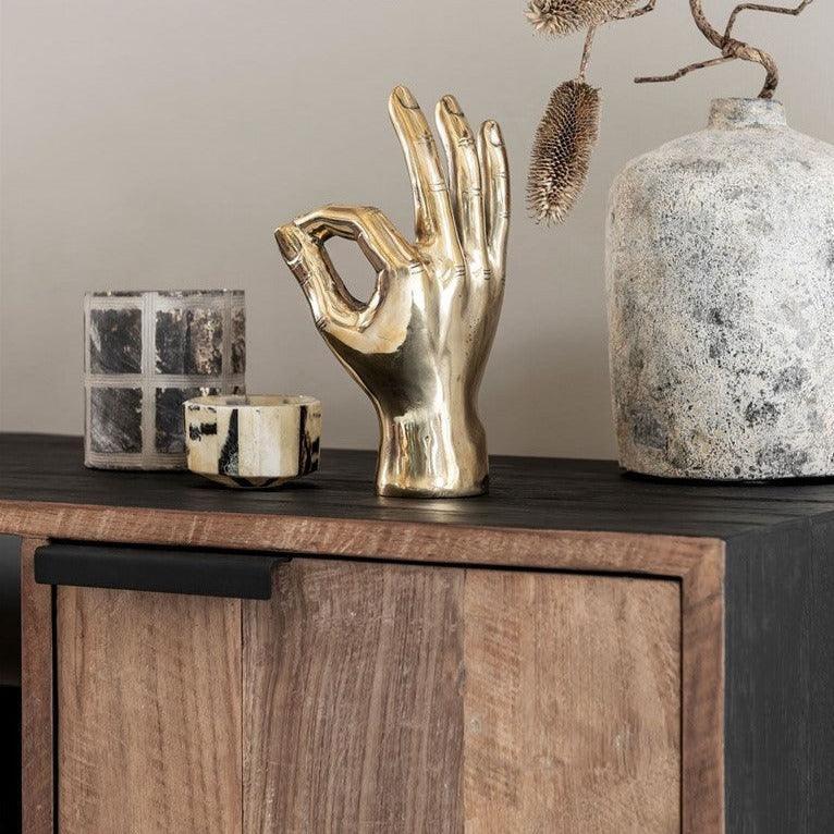 De meubels uit de Cosmo collectie onderscheiden zich door de opvallende combinatie van naturel en zwart teakhout. Dit zorgt voor spannende contrasten tussen het hout, metalen deuren en strakke onderstel.