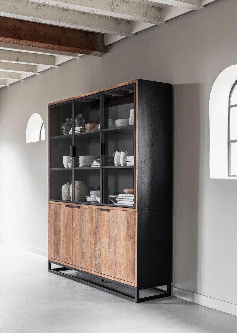 Vitrinekast Cosmo van het merk DTP Home is een echte eyecatcher in je interieur. De kast is gemaakt van gerecycled teakhout, waarbij de zijkant van de kast is afgewerkt met een zwarte beits en finish. De binnenkant is afgewerkt met zwarte verf, een perfecte achtergrond voor accessoires en boeken. Daarnaast is er genoeg opbergruimte achter de deuren, die een elegante uitstraling krijgen door de dunne metalen handgreep.
