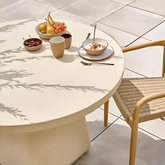 Dankzij het duurzame materiaal vezelcement is de Makura tafel geschikt voor zowel binnen als buiten gebruik. De subtiele tint gebroken wit past moeiteloos in verschillende woonstijlen, van modern en minimalistisch tot bohemian en industrieel. Deze ronde vorm zorgt bovendien voor een intieme setting waarbij iedereen evenveel plek heeft aan tafel.