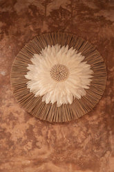 Voeg een vleugje exotische charme toe aan jouw interieur met de Alang Alang Feather Juju. Dit ronde wandkunstwerk, met zijn elegante witte veren en delicate witte kaurischelpen, is de perfecte aanvulling voor elke ruimte. De veren en schelpen zijn zorgvuldig geplaatst op gedroogd alang alang gras, wat een natuurlijke ondertoon geeft aan het geheel. Dit intrigerende stuk wanddecoratie brengt een vleugje kustschoonheid in jouw huis.